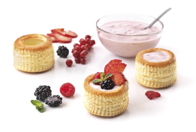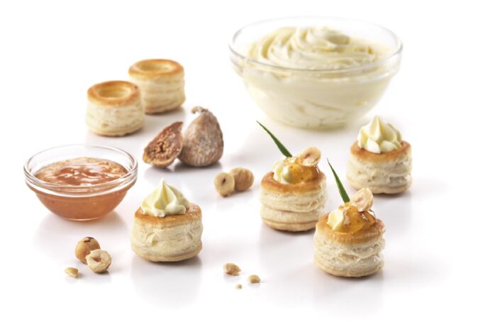 Mezclar las tiras de surimi con la mahonesa y rellenar los volovanes Mariebel; encima poner las gambitas cocidas y unas finas láminas de rabanitos y decorar con cebollino picado.